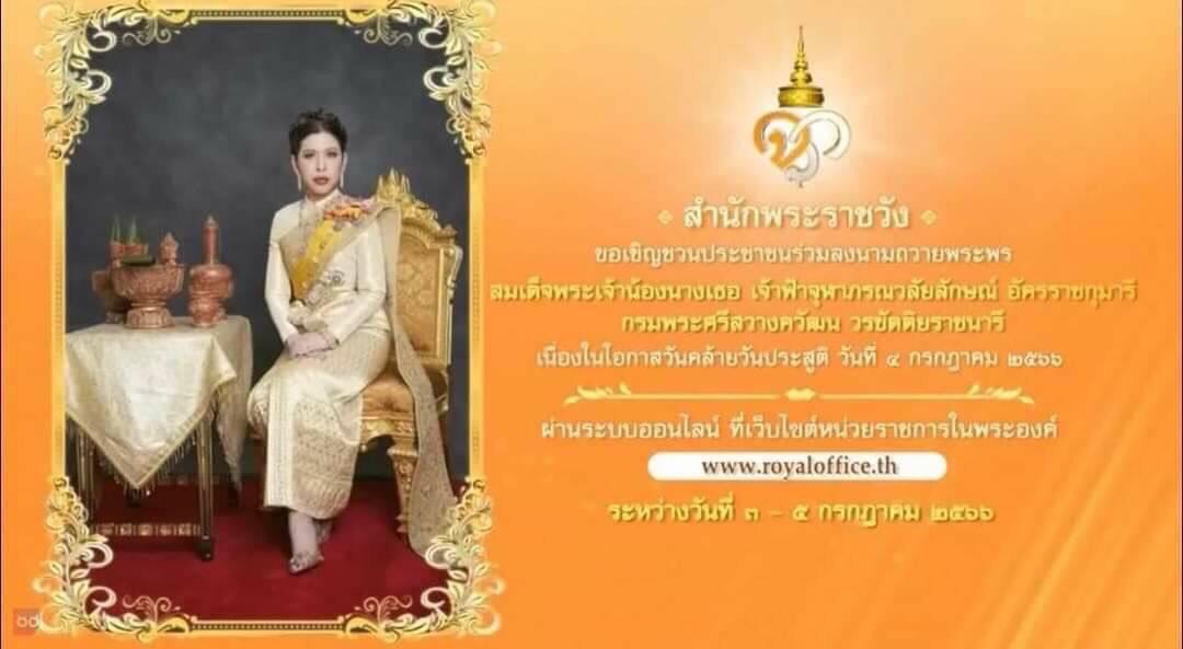 เนื่องในโอกาสวันคล้ายวันประสูติ วันที่ 4 กรกฎาคม 2566 ผ่านระบบออนไลน์ ที่เว็บไซต์หน่วยราชการในพระองค์ www.royaloffice.th ระหว่างวันที่ 3 - 5 กรกฎาคม 2566