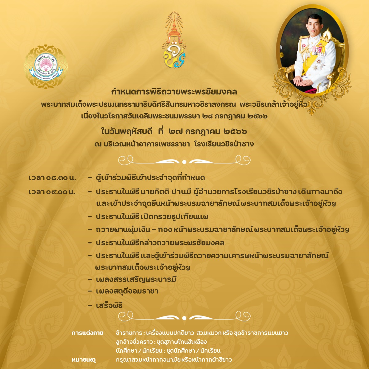 กำหนดการพิธีถวายพระพรชัยมงคลพระบาทสมเด็จพระปรเมนทรรามาธิบดีศรีสินทรมหาวชิราลงกรณ พระวชิรเกล้าเจ้าอยู่หัว เนื่องในวโรกาสวันเฉลิมพระชนมพรรษา ในวันที่ 27 กรกฎาคม 2566 ณ บริเวณหน้าอาคารเพชรราชา ตั้งแต่เวลา 08.30 น. - 09.30 น.