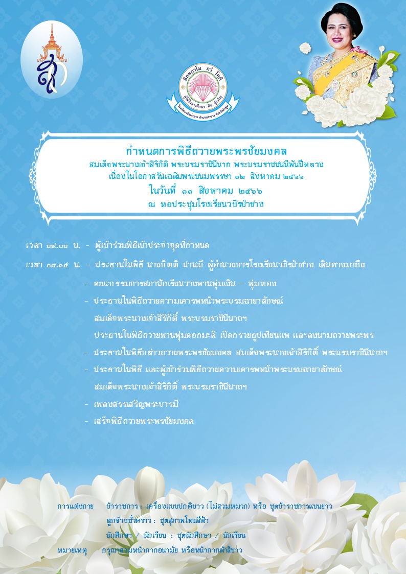กำหนดการพิธีถวายพระพรชัยมงคลล สมเด็จพระนางเจ้าสิริกิติ์ พระบรมราชินีนาถ พระบรมราชชนนีพันปีหลวง เนื่องในโอกาสวันเฉลิมพระชนมพรรษา 12 สิงหาคม 2566
