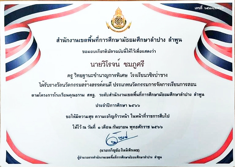 1. นวัตกรรมสร้างสรรค์คนดี ประเภทนวัตกรรมการจัดการเรียนการสอน ตามโครงการโรงเรียนคุณธรรม สพฐ.