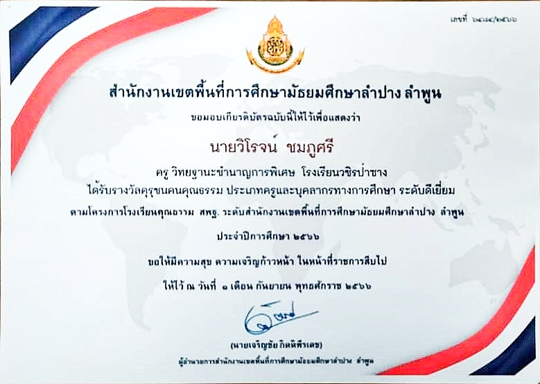 โรงเรียนวชิรป่าซาง ขอแสดงความยินดี กับ ครูวิโรจน์ ชมภูศรี