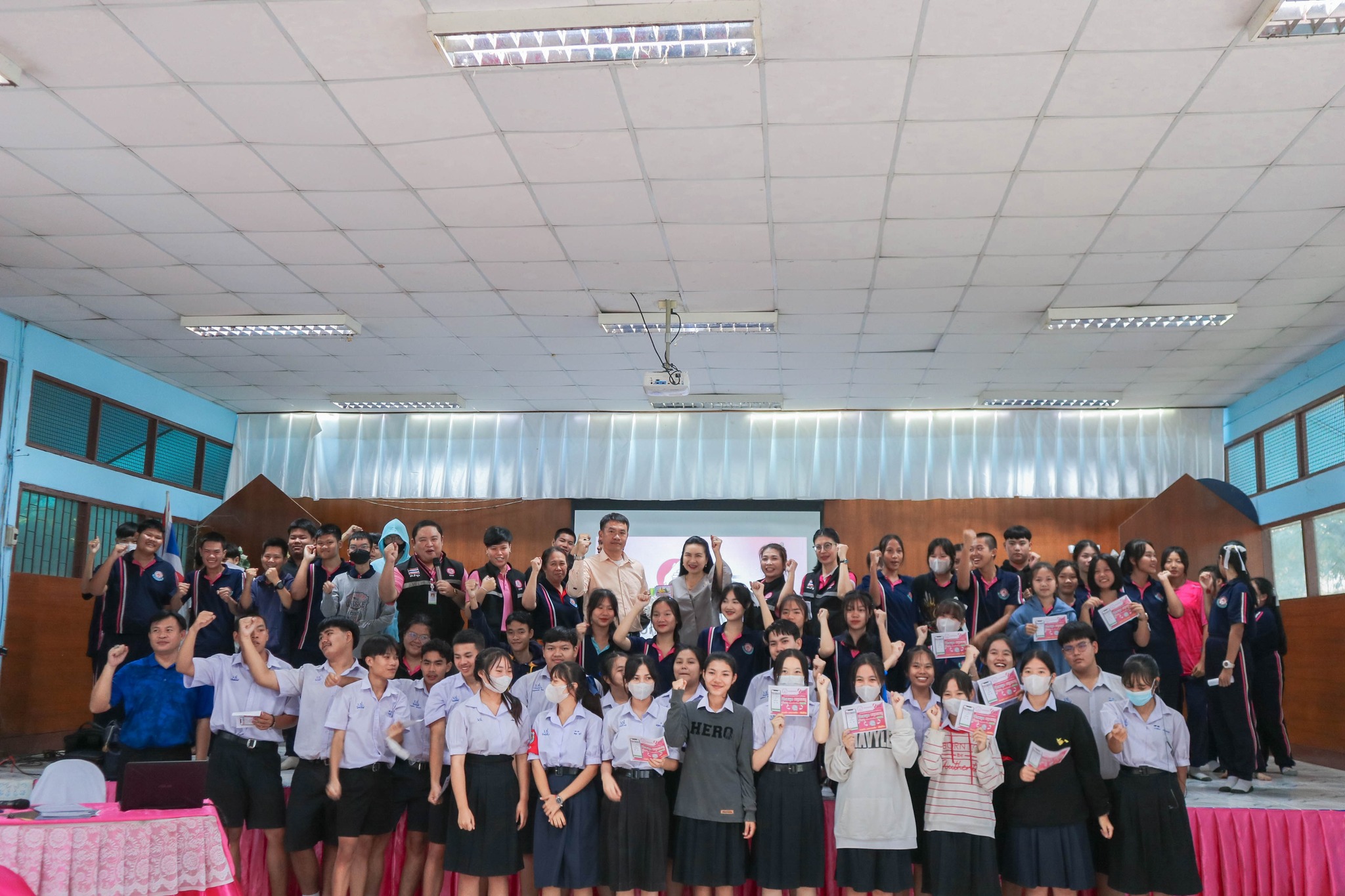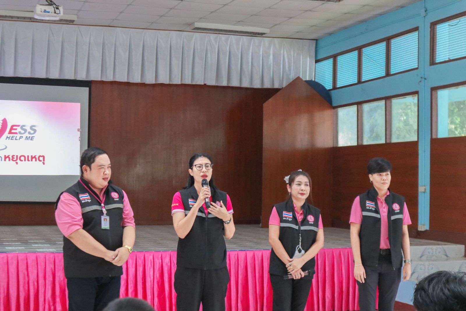 - เจ้าหน้าที่แจกสื่อ ESS Help me ระบบแจ้งเหตุฉุกเฉิน (โปรเสตอร์) ให้กับหัวหน้าทุกชั้น