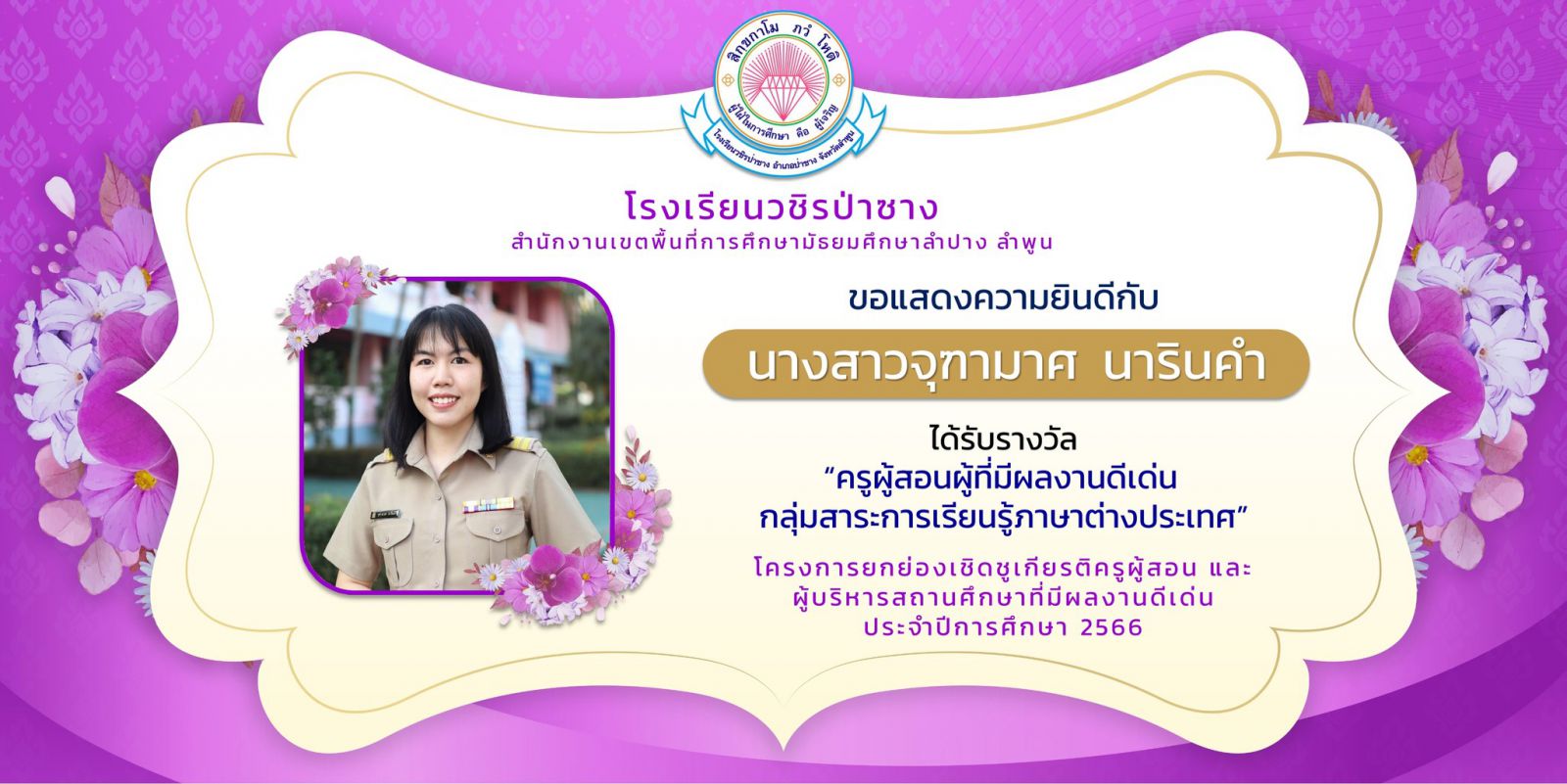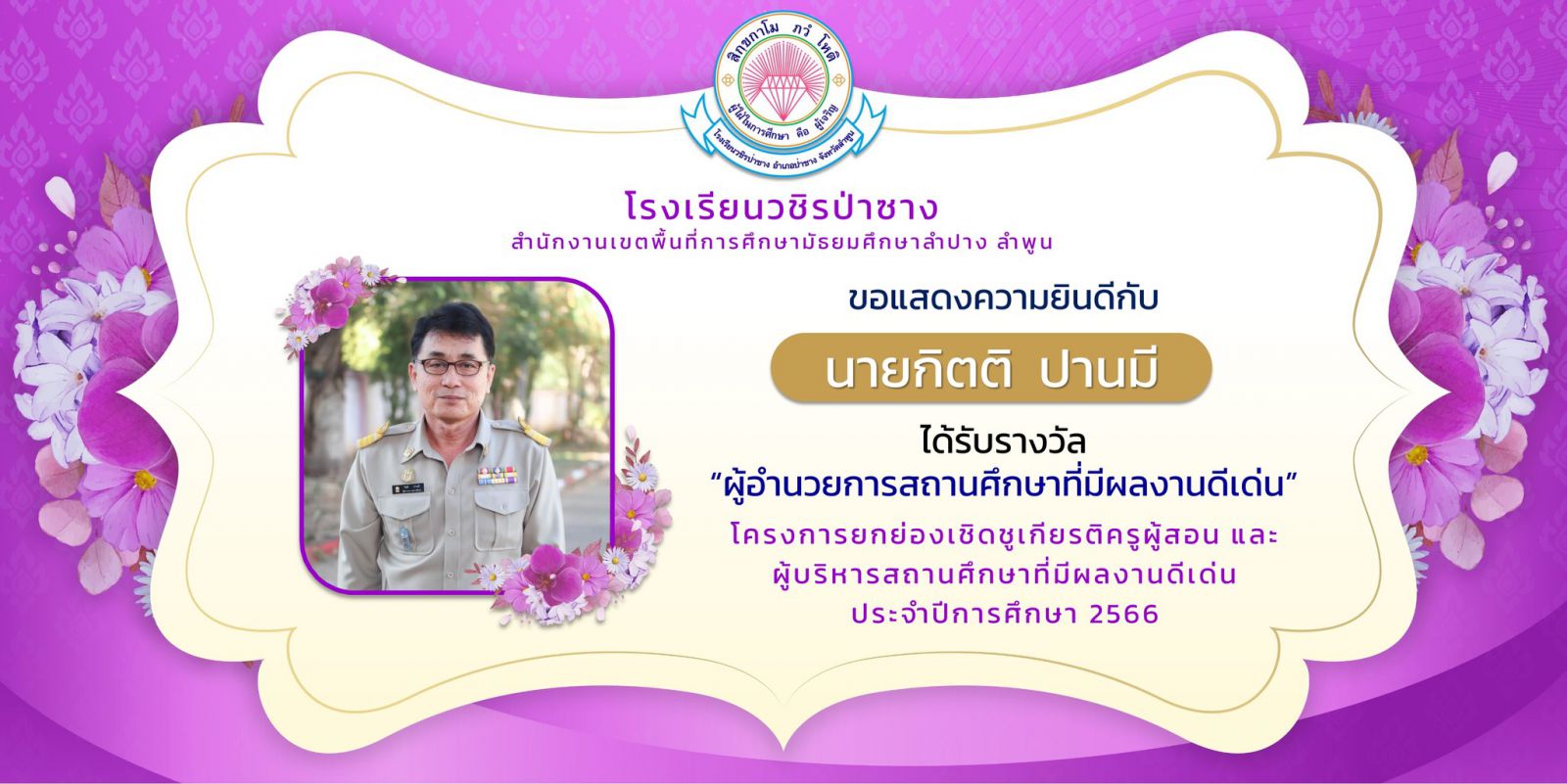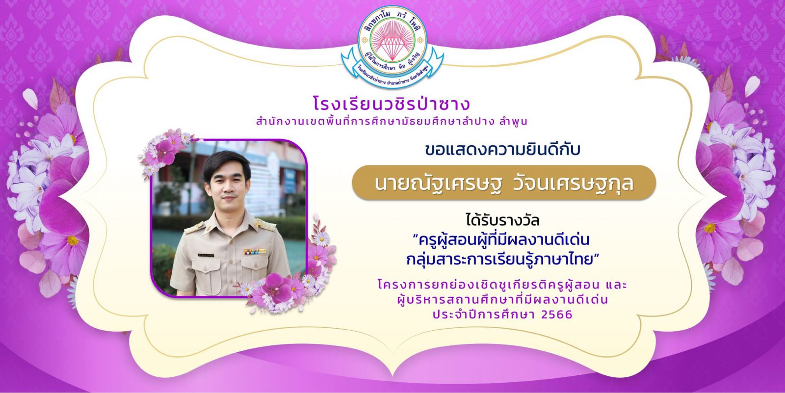 โรงเรียนวชิรป่าซาง ขอแสดงความยินดี กับผู้บริหารและคณะครูทุกท่าน ในโครงการยกย่องเชิดชูเกียรติครูผู้สอนและผู้บริหารสถานศึกษาที่มีผลงานดีเด่น ประจำปีการศึกษา 2566