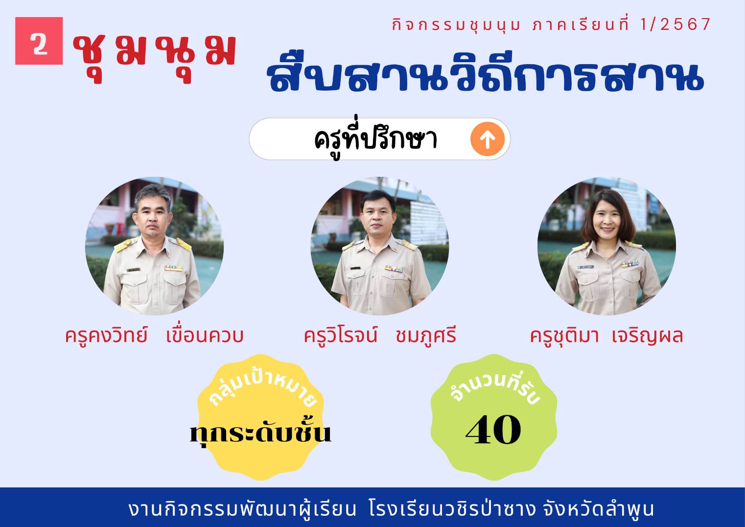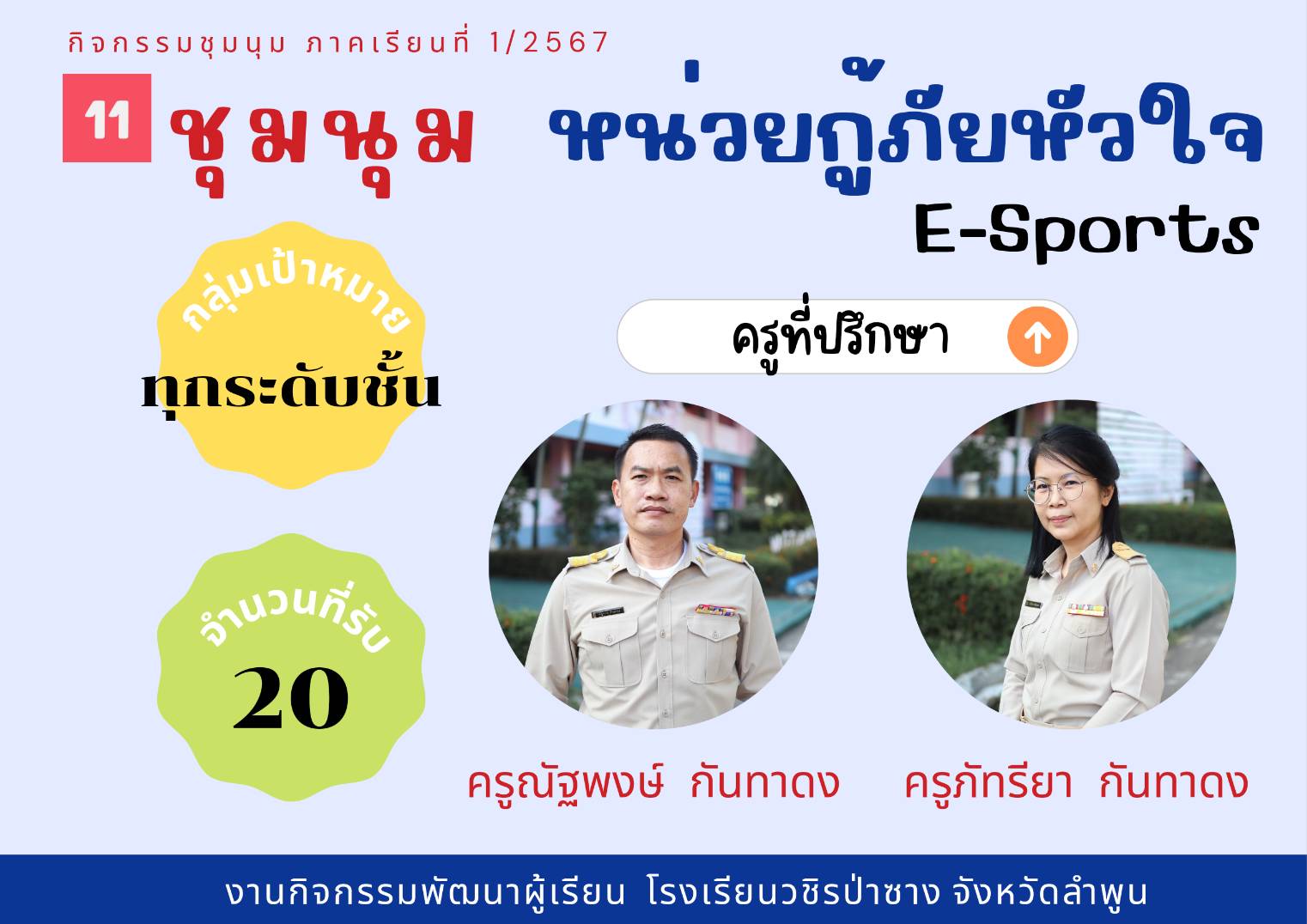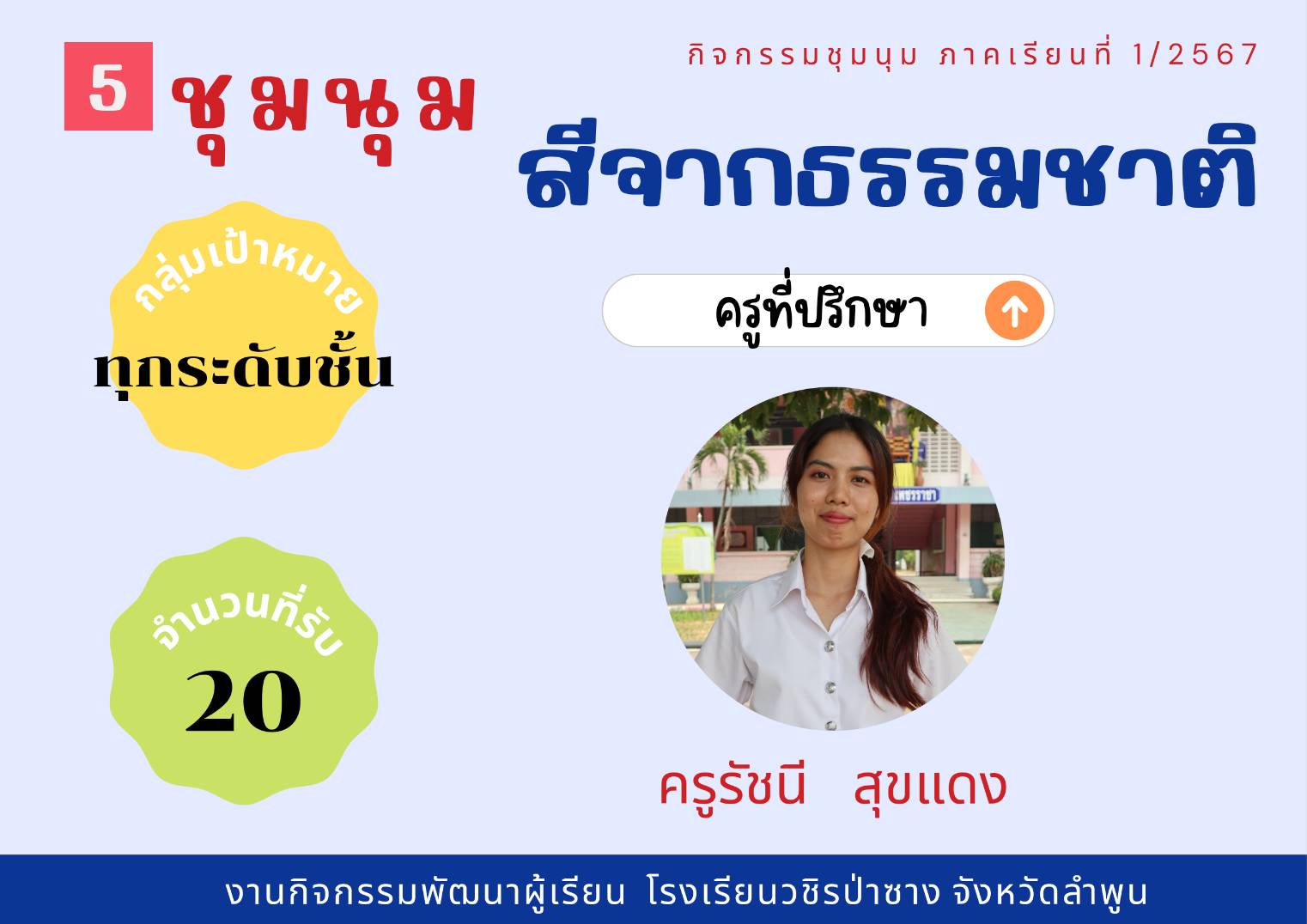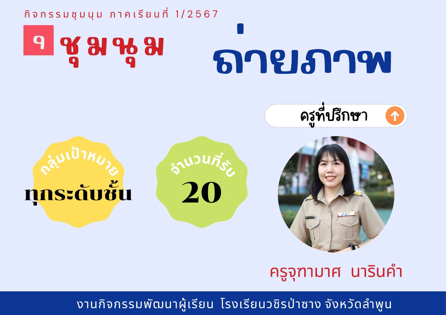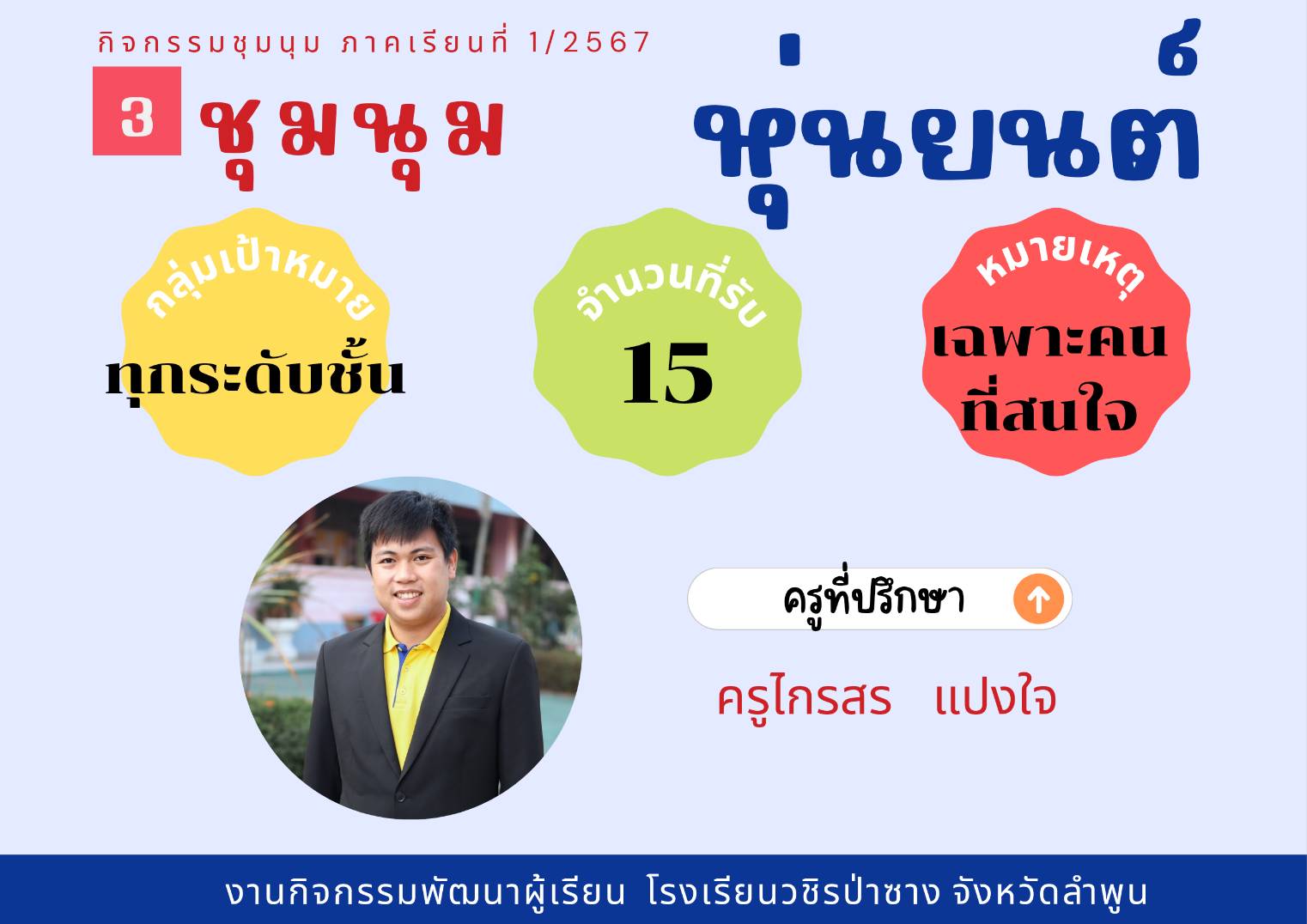 ประชาสัมพันธ์รายชื่อกิจกรรมชุมนุม ประจำภาคเรียนที่ 1/2567 โดยกิจกรรมพัฒนาผู้เรียนจะดำเนินการให้นักเรียนได้เลือกชุมนุมในวันที่ 23 พฤษภาคม 2567 คาบ 8 (คาบชุมนุม)