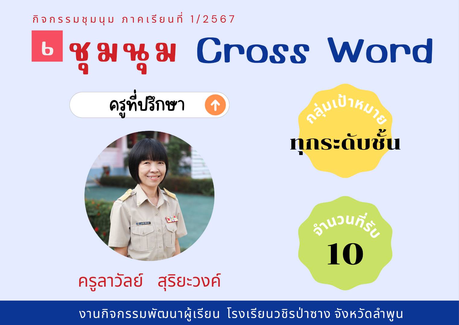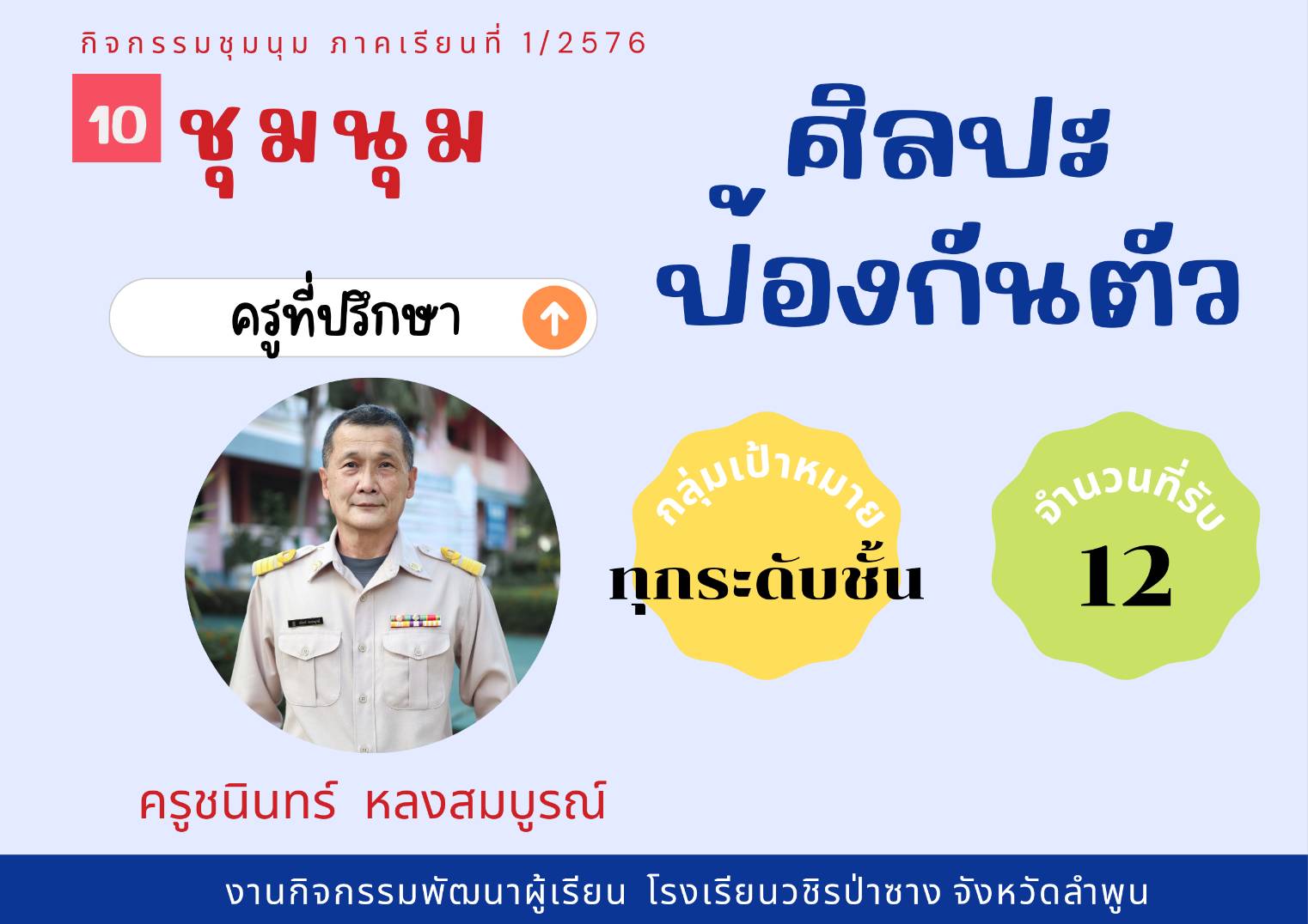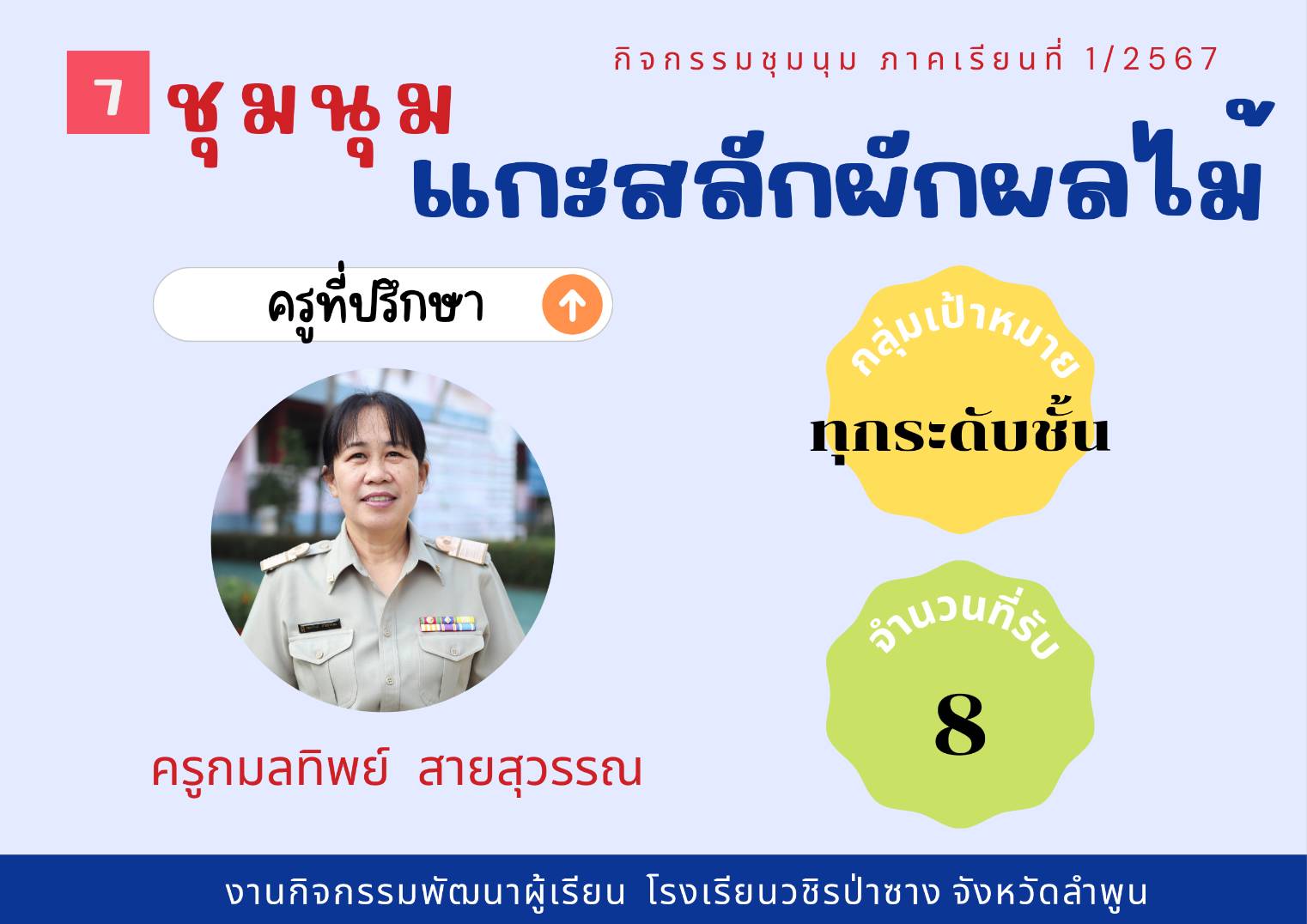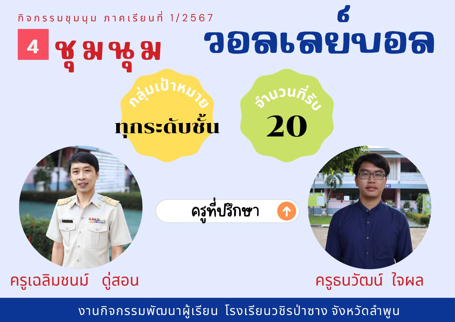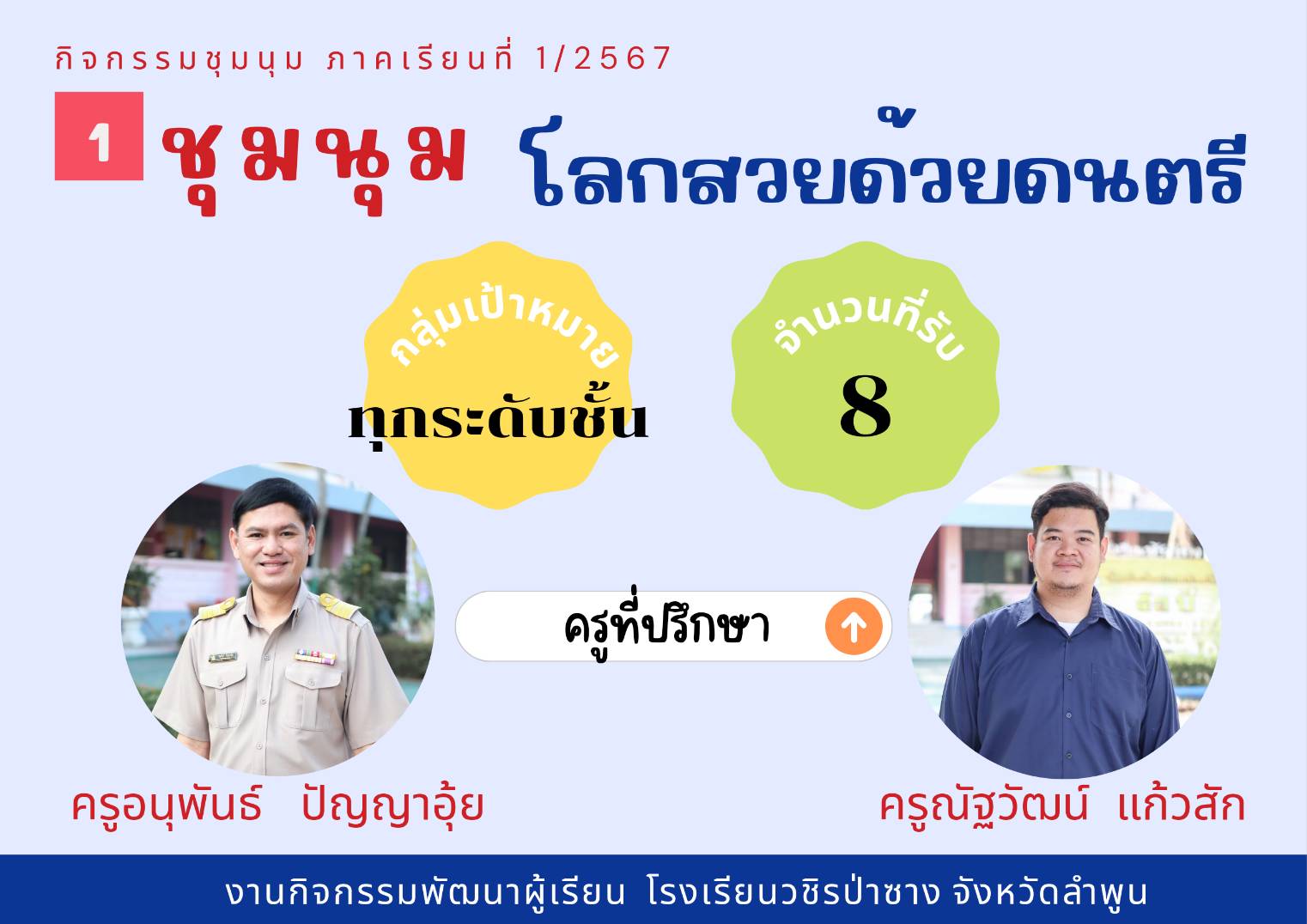 ประชาสัมพันธ์รายชื่อกิจกรรมชุมนุม ประจำภาคเรียนที่ 1/2567 โดยกิจกรรมพัฒนาผู้เรียนจะดำเนินการให้นักเรียนได้เลือกชุมนุมในวันที่ 23 พฤษภาคม 2567 คาบ 8 (คาบชุมนุม)