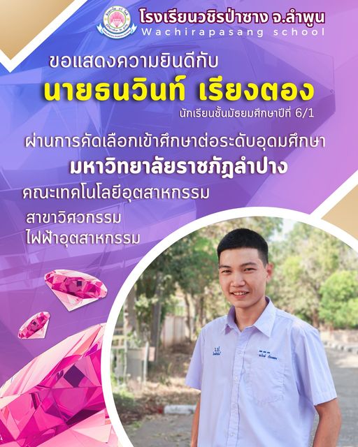 โรงเรียนวชิรป่าซาง จ.ลำพูน ขอแสดงความยินดี กับ "เพชรวชิรป่าซาง " นายธนวินท์ เรียงตอง นักเรียนชั้นมัธยมศึกษาปีที่ 6 ได้ผ่านการคัดเลือกให้เข้าศึกษาต่อในระดับอุดมศึกษา ประจำปีการศึกษา 2567 คณะเทคโนโลยีอุตสาหกรรม สาขาไฟฟ้าอุตสาหกรรม มหาวิทยาลัยราชภัฏลำปาง จ.ลำปาง