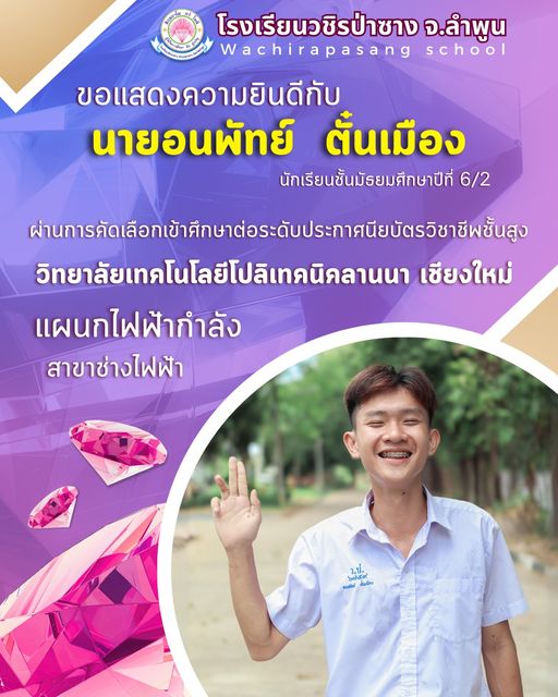โรงเรียนวชิรป่าซาง จ.ลำพูน ขอแสดงความยินดี กับ "เพชรวชิรป่าซาง " นายอนพัทย์ ตั๋นเมือง นักเรียนชั้นมัธยมศึกษาปีที่ 6 ได้ผ่านการคัดเลือกให้เข้าศึกษาต่อในระดับประกาศนียบัตรวิชาชีพชั้นสูง ประจำปีการศึกษา 2567 แผนกไฟฟ้ากำลัง สาขาช่างไฟฟ้า วิทยาลัยเทคโนโลยีโปลิเทคนิคลานนา เชียงใหม่ จ.เชียงใหม่