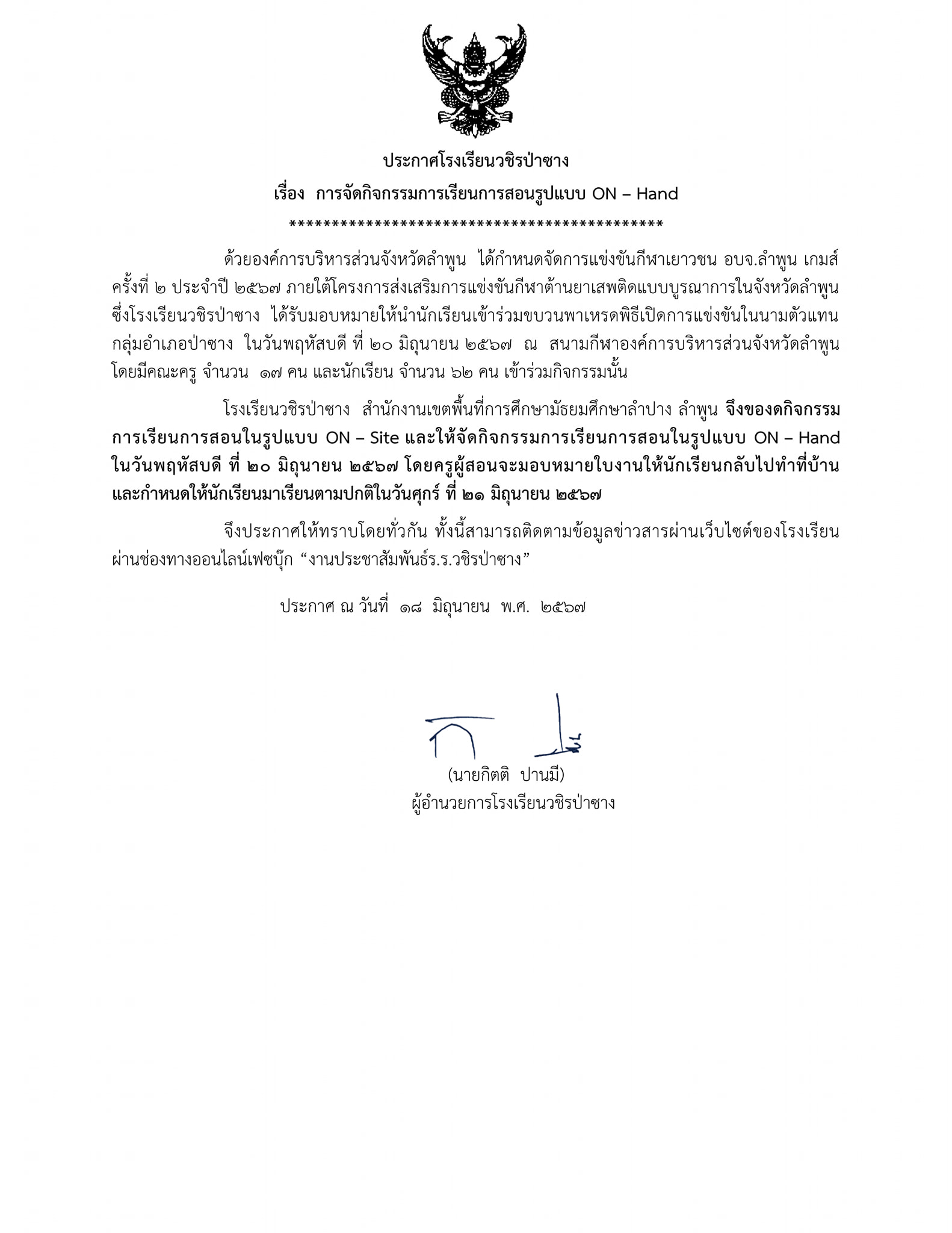 โรงเรียนวชิรป่าซาง จึงของดจัดกิจกรรมการเรียนการสอนในรูปแบบ On-site และให้จัดกิจกรรมการเรียนการสอนในรูปแบบ On-hand ในวันพฤหัสบดีที่ 20 มิถุนายน 2567 โดยให้ครูผู้สอนมอบหมายงานให้