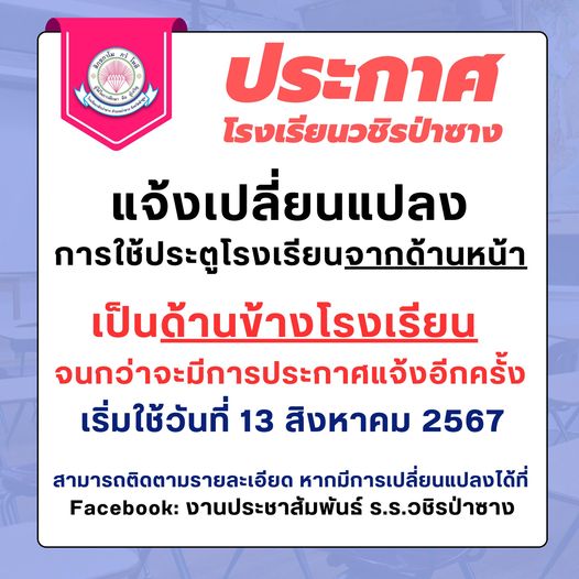 ประกาศโรงเรียนวชิรป่าซาง เรื่อง แจ้งเปลี่ยนแปลงการใช้ประตูโรงเรียน