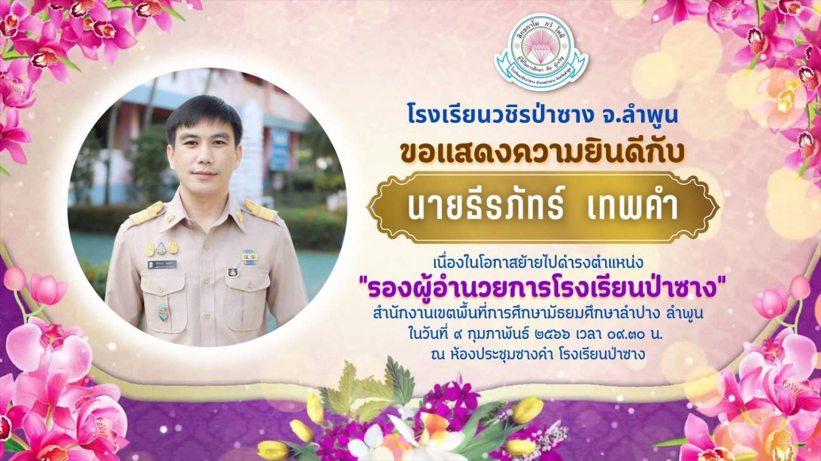 โรงเรียนวชิรป่าซาง ขอแสดงความยินดีกับ "นายธีรภัทร์ เทพคำ" เนื่องในโอกาสย้ายไปดำรงตำแหน่ง "รองผู้อำนวยการโรงเรียนป่าซาง" สำนักงานเขตพื้นที่การศึกษามัธยมศึกษาลำปาง ลำพูน ในวันที่ ๙ กุมภาพันธ์ ๒๕๖๖ เวลา ๐๙.๓๐ น. ณ ห้องประชุมซางคำ โรงเรียนป่าซาง