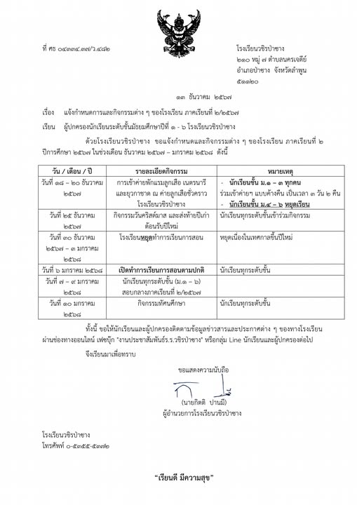 แจ้งกำหนดการและกิจกรรมต่าง ๆ ของโรงเรียนภาคเรียนที่ 2/2567 ในช่วงเดือนธันวาคม 2567 - มกราคม 2568