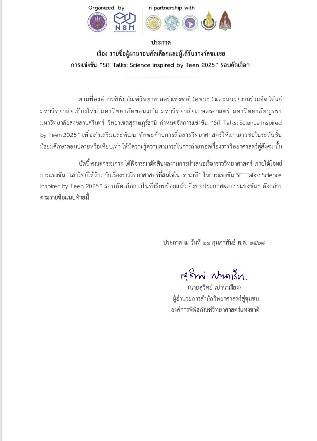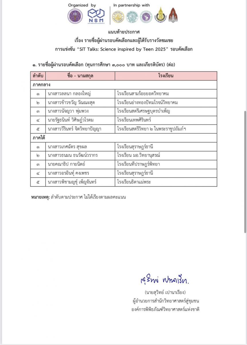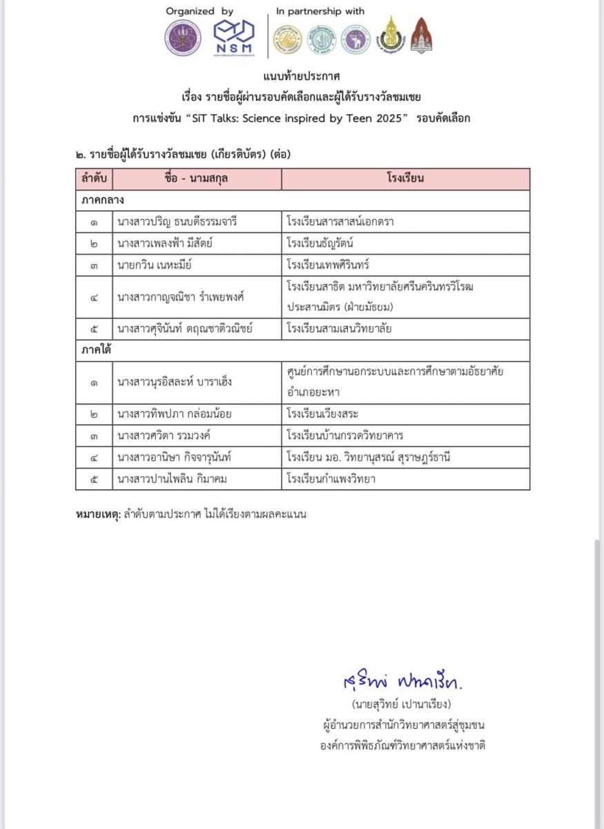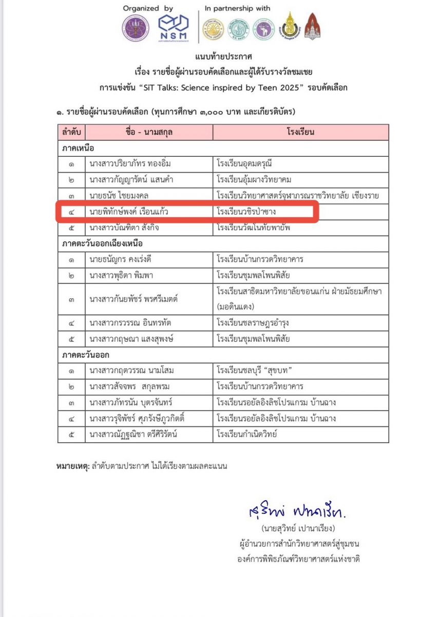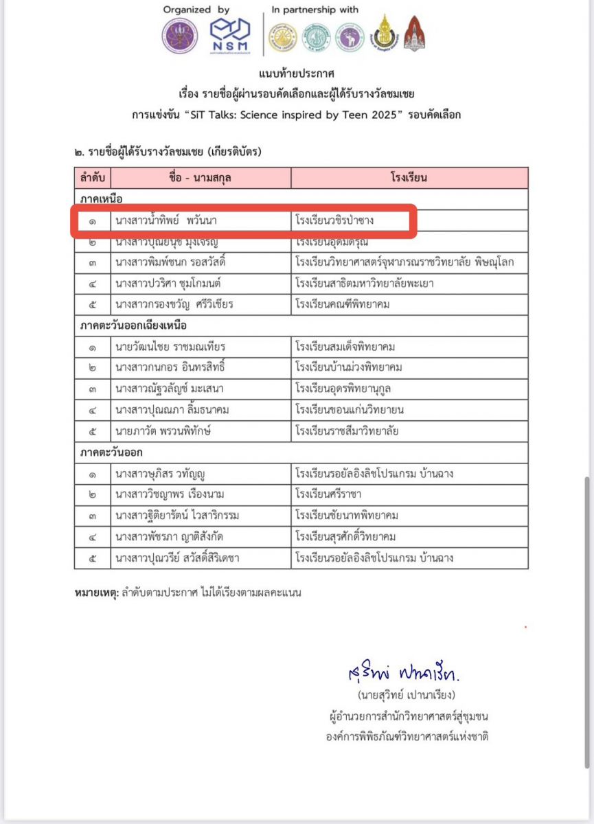 ในการเเข่งขัน  "เล่าวิทย์ให้ว้าว กับเรื่องราววิทยาศาสตร์ที่น่าสนใจ 3 นาที" SiT Talks: Science inspired by Teen 2025  จัดโดย องค์การพิพิธภัณฑ์วิทยาศาสตร์แห่งชาติ (อพวช.)
