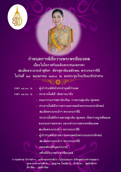 กำหนดการพิธีถวายพระพรชัยมงคลเนื่องในโอกาสวันเฉลิมพระชนมพรรษา สมเด็จพระนางเจ้าสุทิดา พัชรสุธาพิมลลักษณ พระบรมราชินี โดยทางโรงเรียนจัดกิจกรรมวันที่ ๒๙ พฤษภาคม ๒๕๖๘ ณ หอประชุมโรงเรียนวชิรป่าซาง