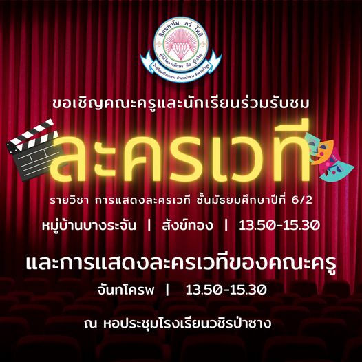 ขอเชิญคณะครูและนักเรียนร่วมรับชม ละครเวที รายวิชาการแสดงละครเวที (พ30211) ชั้นมัธยมศึกษาปีที่ 6/2 เรื่อง หมู่บ้านบางระจัน | สังข์ทอง และพบกับการแสดงละครเวทีของคณะครู เรื่อง จันทโครพ ในวันพฤหัสบดี ที่ 23 กุมภาพันธ์ 2566 เวลา 13.50 น. - 15.30 น. ณ หอประชุมโรงเรียนวชิรป่าซาง
