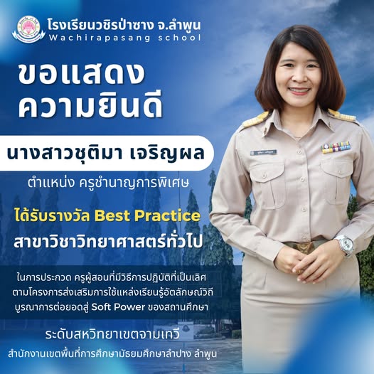 โรงเรียนวชิรป่าซาง จังหวัดลำพูน ขอแสดงความยินดี กับ "นางสาวชุติมา เจริญผล" ตำแหน่ง ครูชำนาญการพิเศษ ได้รับรางวัล ครูผู้สอนที่มีวิธีปฏิบัติที่เป็นเลิศ (Best Practice) สาขาวิชาวิทยาศาสตร์ทั่วไป ในการประกวด ครูผู้สอนที่มีวิธีการปฏิบัติที่เป็นเลิศ ตามโครงการส่งเสริมการใช้แหล่งเรียนรู้อัตลักษณ์วิถี บูรณาการต่อยอดสู่ Soft Power ของสถานศึกษา