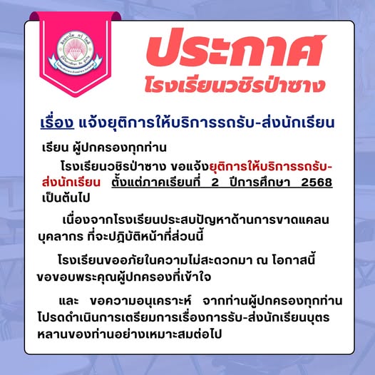 โรงเรียนวชิรป่าซาง ขอแจ้งยุติการให้บริการรถรับ-ส่งนักเรียน ตั้งแต่ภาคเรียนที่ 2 ปีการศึกษา 2568 เป็นต้นไป