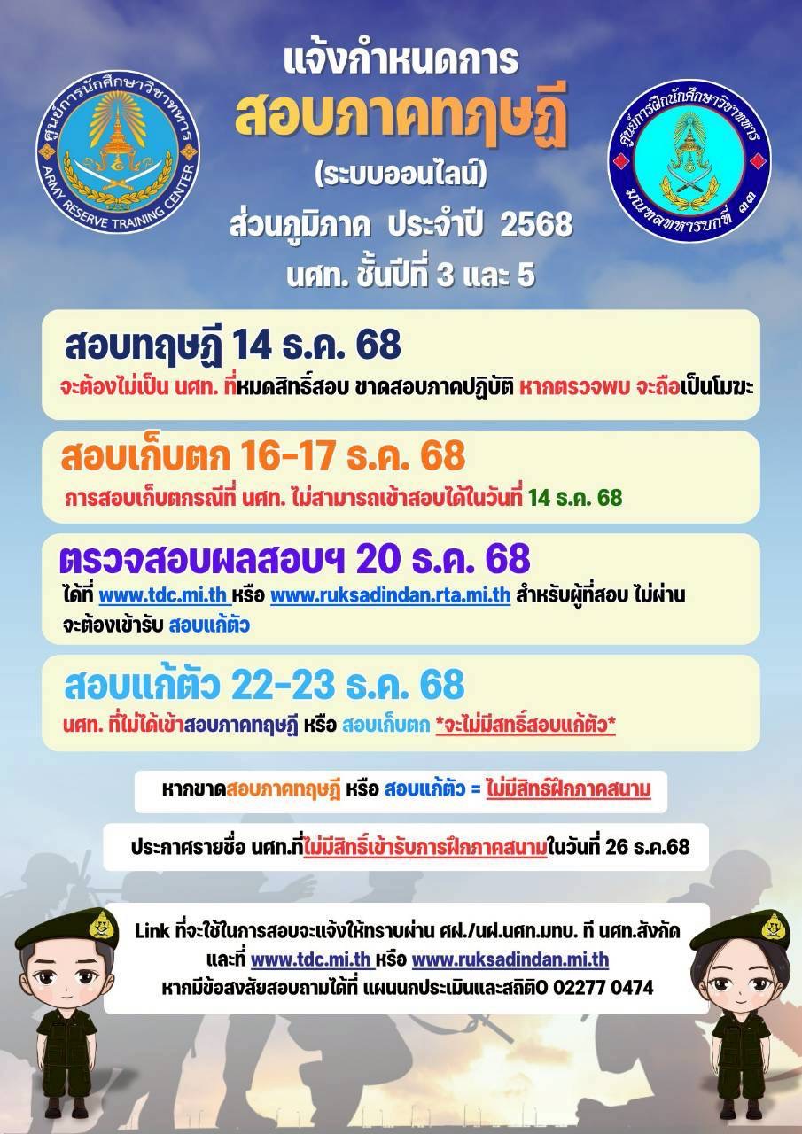กำหนดการสอบแก้ตัวภาคทฤษฎี นศท. ที่คะแนนไม่ผ่านตามเกณฑ์ที่กำหนด ในวันที่ 22-23 ธ.ค. 68