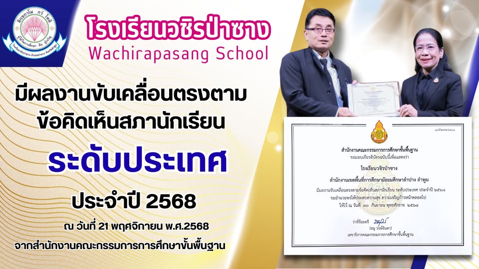 โรงเรียนวชิรป่าซาง มีผลงานขับเคลื่อนตรงตามข้อคิดเห็นสภานักเรียน "ระดับประเทศ" ประจำปี 2568