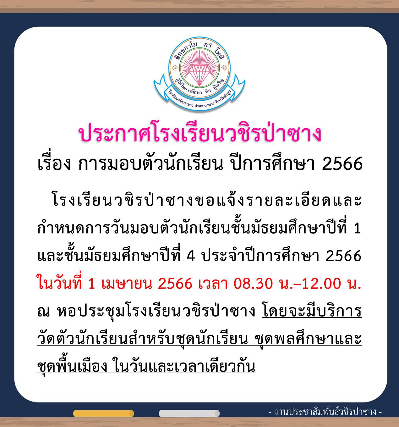 โรงเรียนวชิรป่าซางขอแจ้งรายละเอียดและกำหนดการวันมอบตัวนักเรียนชั้นมัธยมศึกษาปีที่ 1 และชั้นมัธยมศึกษาปีที่ 4 ประจำปีการศึกษา 2566