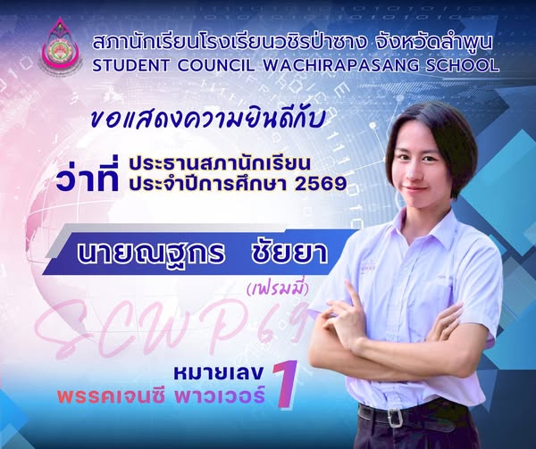 สภานักเรียนโรงเรียนวชิรป่าซาง ขอแสดงความยินดีกับ "ว่าที่ประธานสภานักเรียนโรงเรียนวชิรป่าซาง ปีการศึกษา 2569 คนใหม่ "นายณฐกร ชัยยา" (เฟรมมี่) นักเรียนชั้นมัธยมศึกษาปีที่ 4/2 ผู้ลงสมัครประธานสภานักเรียน พรรคหมายเลข 1 พาวเวอร์ ชนะการเลือกตั้งด้วยคะแนนเสียง 104 เสียง