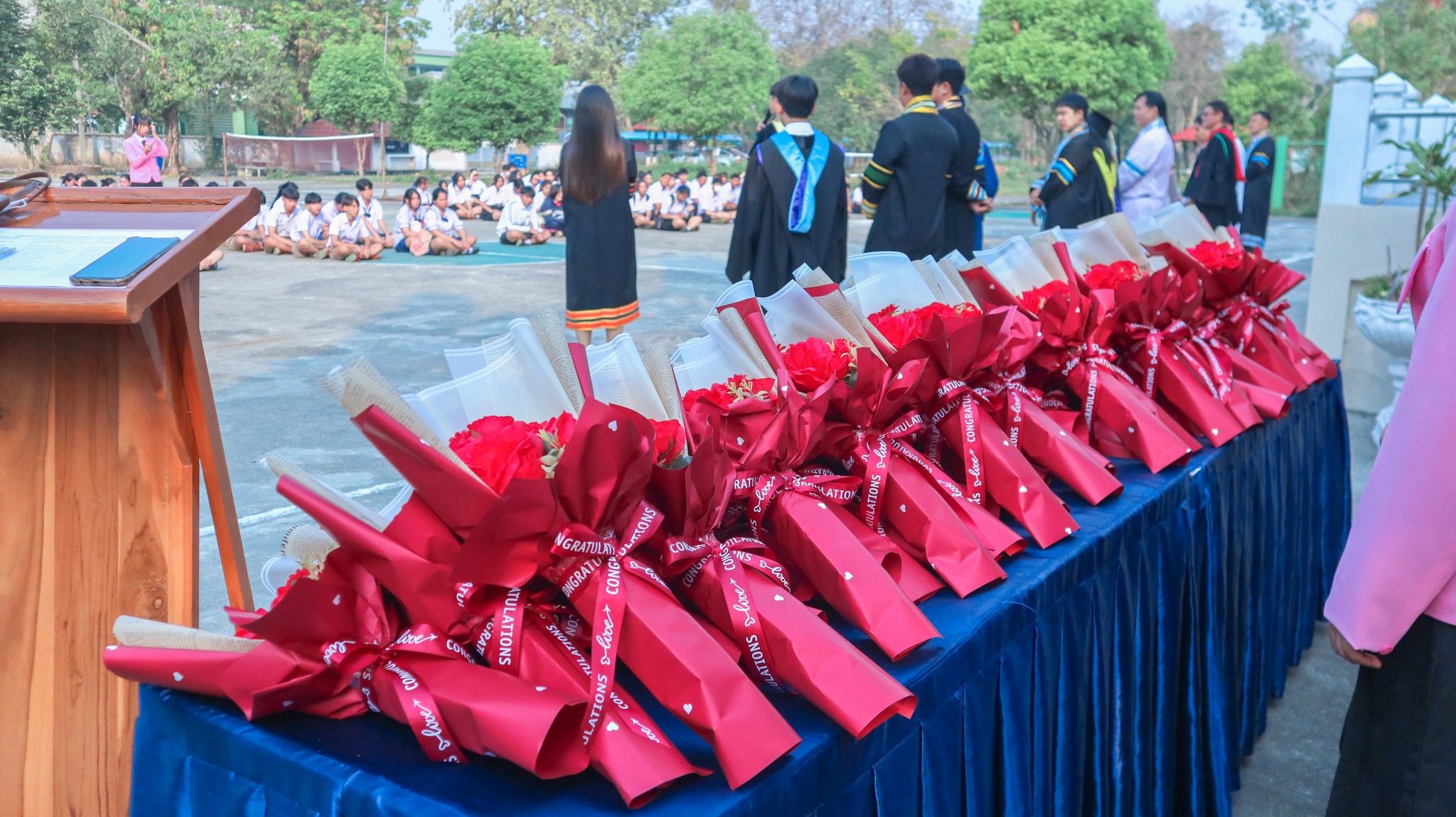 ภาพบรรยากาศกิจกรรมมอบช่อดอกไม้แสดงความยินดีแก่นักเรียนชั้นมัธยมศึกษาปีที่ 6 ในโครงการเด็กดีมีที่เรียนและเด็กดีมีงานทำ ในพิธีมอบใบประกาศนียบัตรและพิธีปัจฉิมนิเทศนักเรียนชั้นมัธยมศึกษาปีที่ 3 และชั้นมัธยมศึกษาปีที่ 6 ปีการศึกษา 2568 “รุ่นวชิรานุสรณ์ ว.ป.’68” มีความหมายว่า "การระลึกถึงความผูกพันที่ล้ำค่า" วันที่ 6 มีนาคม 2569 ที่ผ่านมา