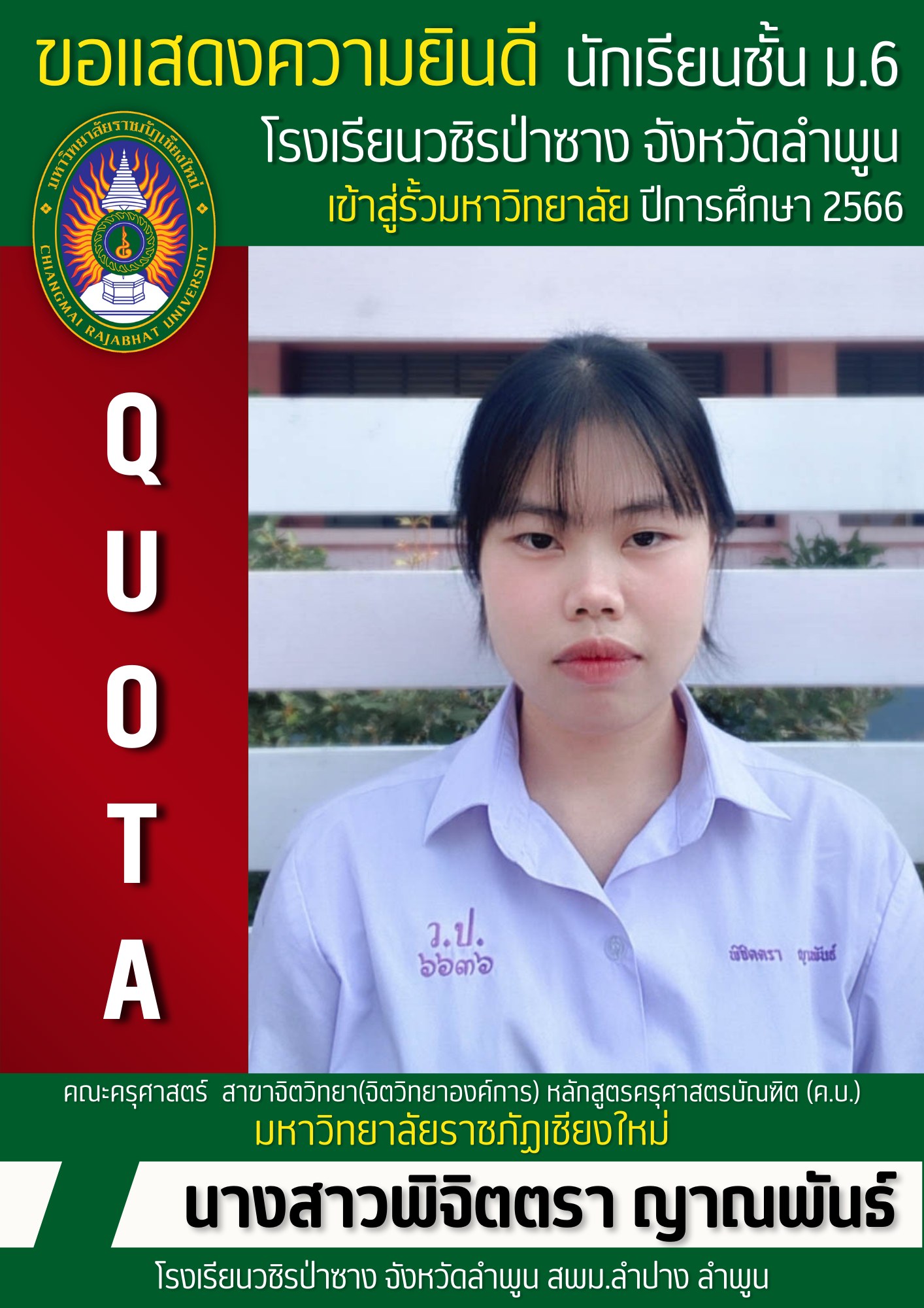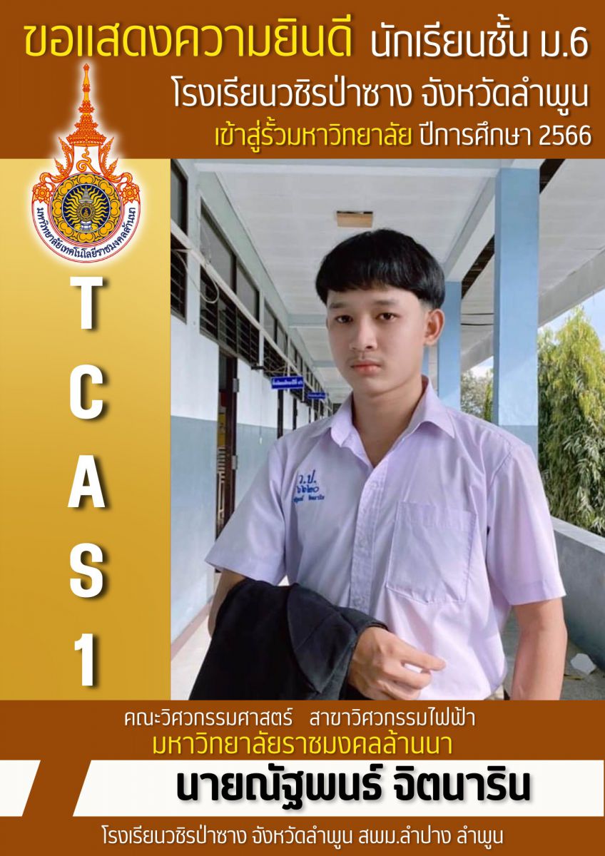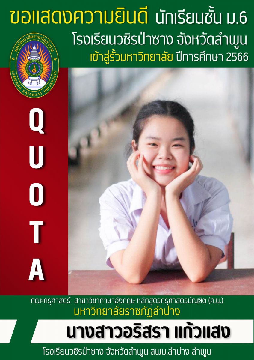 โรงเรียนวชิรป่าซาง จ.ลำพูน ขอแสดงความยินดี กับ "เพชรวชิรป่าซาง" นักเรียนชั้นมัธยมศึกษาปีที่ 6 ได้ผ่านการคัดเลือกให้เข้าศึกษาต่อในระดับอุดมศึกษา ประจำปีการศึกษา 2566 ระบบ Quota ดังนี้