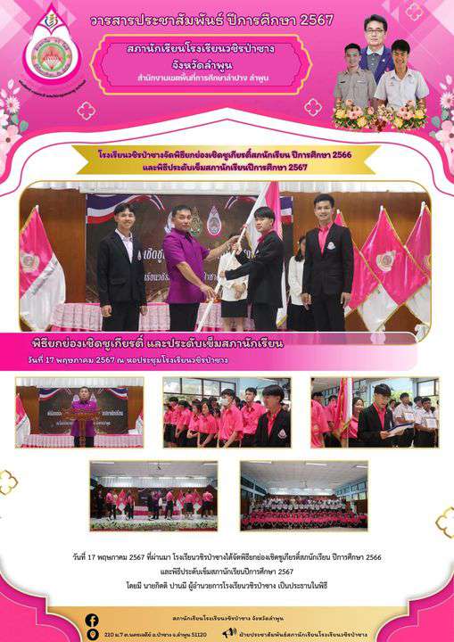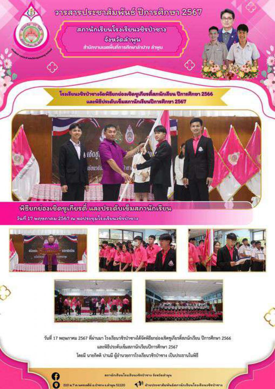 วันที่ 17 พฤษภาคม 2567 ที่ผ่านมา โรงเรียนวชิรป่าซางได้จัดพิธียกย่องเชิดชูเกียรติ์สภนักเรียน ปีการศึกษา 2566 และพิธีประดับเข็มสภานักเรียนปีการศึกษา 2567 โดยมี นายกิตติ ปานมี ผู้อำนวยการโรงเรียนวชิรป่าซาง เป็นประธานในพิธี