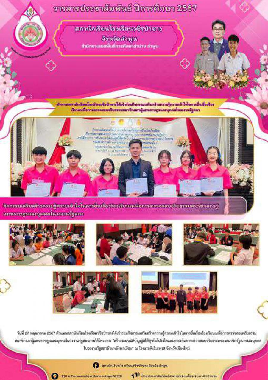 วันที่ 27 พฤษภาคม 2567 ตัวแทนสภานักเรียนโรงเรียนวชิรป่าซางได้เข้าร่วมกิจกรรมเสริมสร้างความรู้ความเรข้าใจในการยื่นเรื่องร้องเรียนเนพื่อการตรวจสอบจริยธรรมสมาชิกสภาผู้แทนราษฎรและบุคคลในวงงานรัฐสภาภายใต้โครงการ "สร้างระบบนิติบัญญัติให้สุจริตโปร่งใสและยกระดับการตรวจสอบจริยธรรมของสมาชิกรัฐสภาและบุคคลในวงงานรัฐสภาด้วยพลังพลเมือง” ณ โรงแรมดิเอ็มเพรส จังหวัดเชียงใหม่