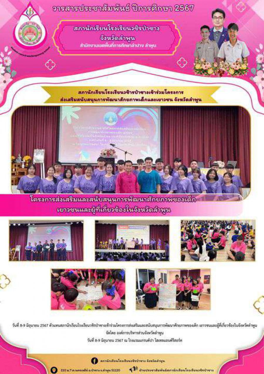 วันที่ 8-9 มิถุนายน 2567 ตัวแทนสภานักเรียนโรงเรียนวชิรป่าซางเข้าร่วมโครงการส่งเสริมและสนับสนุนการพัฒนาศักยภาพของเด็ก เยาวชนและผู้ที่เกี่ยวข้องในจังหวัดลำพูน จัดโดย องค์การบริหารส่วนจังหวัดลำพูน ณ โรงแรมแกรนด์ปา โฮเทลแอนด์รีสอร์ท