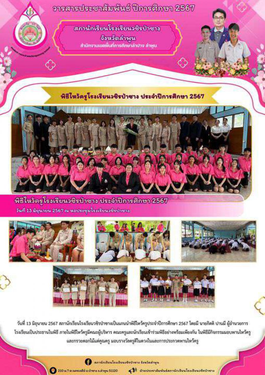 วันที่ 13 มิถุนายน 2567 สภานักเรียนโรงเรียนวชิรป่าซางเป็นแกนนำพิธีไหว้ครูประจำปีการศึกษา 2567 โดยมี นายกิตติ ปานมี ผู้อำนวยการโรงเรียนเป็นประธานในพิธี ภายในพิธีไหว้ครูมีคณะผู้บริหาร คณะครูและนักเรียนเข้าร่วมพิธีอย่างพร้อมเพียงกัน ในพิธีมีกิจกรรมมอบพานไหว้ครูและกรวยดอกไม้แด่คูณครู มอบรางวัลครูดีในดวงในและการประกวดพานไหว้ครู