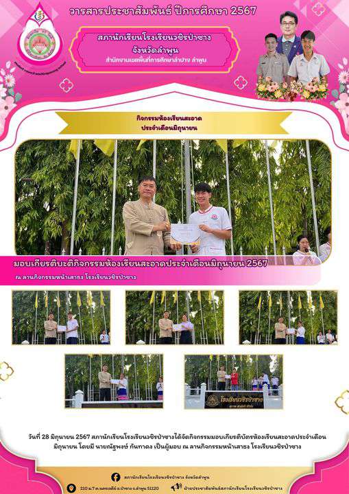 วันที่ 28 มิถุนายน 2567 สภานักเรียนโรงเรียนวชิรป่าซางได้จัดกิจกรรมมอบเกียรติบัตรห้องเรียนสะอาดประจำเดือนมิถุนายน โดยมี นายณัฐพงษ์ กันทาดง เป็นผู้มอบ ณ ลานกิจกรรมหน้าเสาธง โรงเรียนวชิรป่าซาง